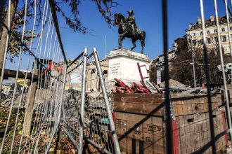 [statue du génléral Dufour à la place Neuve à Genève ... et cinquante mètre plus haut par dessus les murailles face au soleil couchant les maisons des riches ... de ceux-là aussi ... sans plus .. enfin provisoirement ]