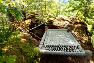 Tu prendras le sentier qui disparaît à l'ombre des arbres. Là, tu liras les empreintes des bêtes sauvages et tu les suivras. Le sentier s'avancera sur la crête entre deux falaises, toi tu courras dans les feuilles mortes, juste pour sentir que tu es une bête sauvage. Devant toi, tu croiras apercevoir deux silhouettes sombres au pied du mur en ruine, mais quand tu y arriveras tu ne verras personne. Puis tu verras près du chemin un bloc de molasse énorme, de plusieurs mètres de haut et colonisé par les arbres. Tu remarqueras la mince plateforme à hauteur d'épaules, et la piste qui s'en élève entre les racines. Alors tu grimperas à ton tour, utilisant un creux de la roche pour placer ton pied. Comme si c'était fait exprès. Au sommet de cette énorme roche, sur le toit du monde et à l'abri des arbres, tu trouveras un lit de cordes. Alors tu te coucheras là et tu écouteras le vol des martinets.