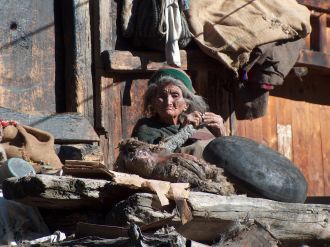 J'observe depuis un moment cette vieille femme tricotant sur sa terrasse. Elle profite des derniers rayons de soleil qui la réchauffent avant l'arrivée des grands froids hivernaux. Dans cette contrée himalayenne, dès que le soleil disparaît en fin de journée, le froid vous glace les veines. En hiver, la famille se blottit autour du vieux poêle de la cuisine alimenté aux bouses de vache, le seul endroit accueillant de la maison.