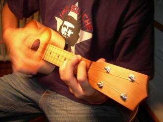 La joie de mon fils est grande en jouant sur le ukulélé que j'ai acheté aujourd'hui.