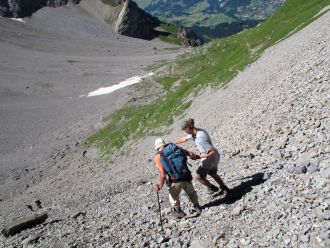 Help ! Help ! résonne contre les parois du Bunderspitz. Quentin pose son sac et aussi sec grimpe dans un pierrier. Je le suis. M'essouffle. Crie : Fais attention !