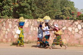 Les vendeuses de fruits et de légumes le long des grandes avenues de Bamako. Plus que la moitié de ses femmes sont des Dogons. Toute la journée elle se rendent au marché parti faire quelques provisions. Avec bébé sur le dos ou à la main, un chargement de 20 kg ou plus sur la tête tous les jours.