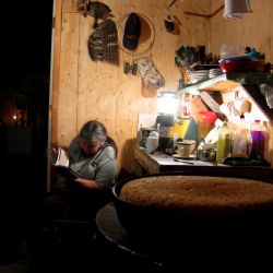 La nuit vient à 19h 45, 1er printemps dans le Nord, les jours vont commencer à rallonger. Une longue soirée s'annonce, le ?'bannock'', pain traditionnel, cuit sur le poêle. Marie parcourt mon livre des traces et indices des animaux. Ses yeux lui font défaut à présent, au lendemain elle le tiendra toute l'après-midi, plus facile à lire à la lumière du jour.