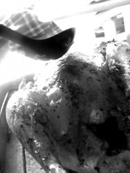 Jus qui perle sur la peau rôtie.