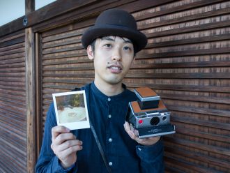 Graphiste (harnaché d'un appareil numérique) photographiant un jardin Zen au Polaroïd SX70.
