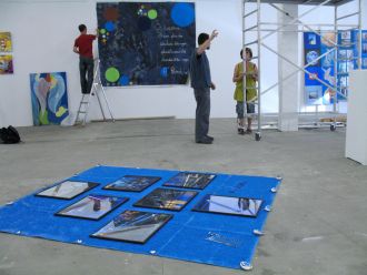 Installation de l'exposition d'arts plastiques de l'été, mes travaux se devinent au premier plan.
