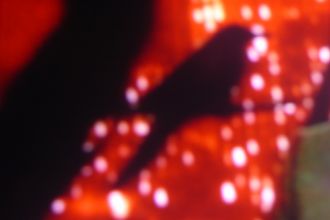 Dans le réfectoire, après la session de yoga du matin, une allemande d'une cinquantaine d'années est assise sur le sol. Sur un tapis de yoga bleu. Elle est blonde, porte un tee-shirt bleu, ses cheveux sont courts. Le soleil qui filtre à travers la moustiquaire crée des éclats de lumière bleue et dorée. Ses cheveux lui dessinent alors comme une couronne de lumière autour du visage. Sa peau blanche est éclairée par des éclats de bleu.