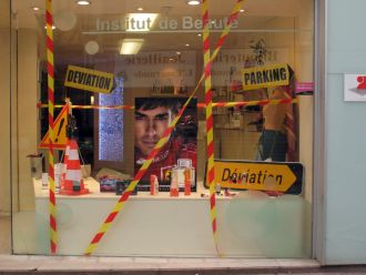 Les travaux dans la rue commerçante deviennent décoration protestatrice dans une vitrine d'institut de beauté.