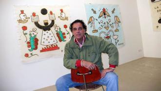 il peint et y mène un galerie d'art. Le voiçi devant ses propres oeuvres "les derniers jours de l'humanité"