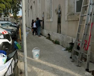 En pleine action, les collages continuent dans le centre ville, pour préparer le week-end patrimoine...