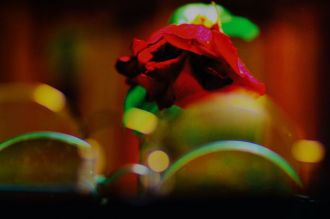 Vu des bulles de savons s'éclater contre une femme nue, en marbre.