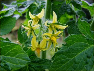 Petites fleurs jaunes sur les branches d'un pied de tomate. Chaque fleur jaune va donner une tomate cerise.