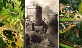 16ème festival photo de St Benoît près de Poitiers ; les tours de la Rochelle vues par Michel Lagarde, et intégrées dans un feuillage d'automne troué.