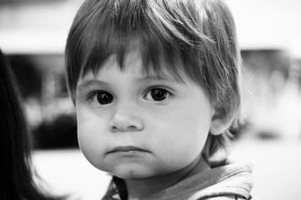 Un jeune visiteur à une exposition photographique