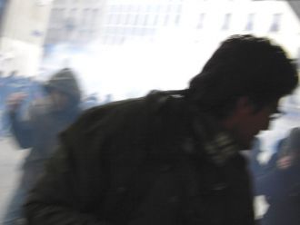 Et paf ! Une bouteille vole, une autre, suivie d'une grêle de bouteilles. Fumigènes. Qui tire quoi ? Confusion. Une grosse clameur enfle, on se croirait à un match de hockey, et vlan, bing et paf. Les yeux brûlent. Les flics chargent. Les autres détallent. Se font coincer, pris en tenailles par un camion blindé cracheur de flotte glacée. J'ai l'impression de voir mon fils, même âge, même allure, mais me souvient qu'il est au ski, au-dessus de ce merdier, il a fait beau au-dessus de 1200, une autre réalité ! Une jeune femme, la trentaine, cogne sur une voiture : « Connard, casse-toi, fous le camp? », le conducteur, un sourire feint, opine du bonnet sans demander son reste. Un flic, au même moment, même endroit, « Monsieur, circulez, s'il vous plaît? ». La teigneuse se retourne vers le policier : « Connard, fous lui la paix? ».
