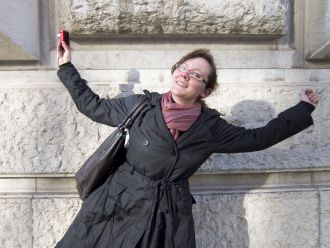 Une jeune femme se penche avec son petit appareil photo rouge sur le soleil qui joue avec les rayons d'une roue de vélo - je m'approche : « Bonjour, je peux?portrait?non, non, ne suis pas photogénique?allez, venez, non, oui, merci? », bat des ailes et s'envole dans sa journée.