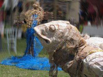 le poisson erre sur la pelouse et s'intéresse à un